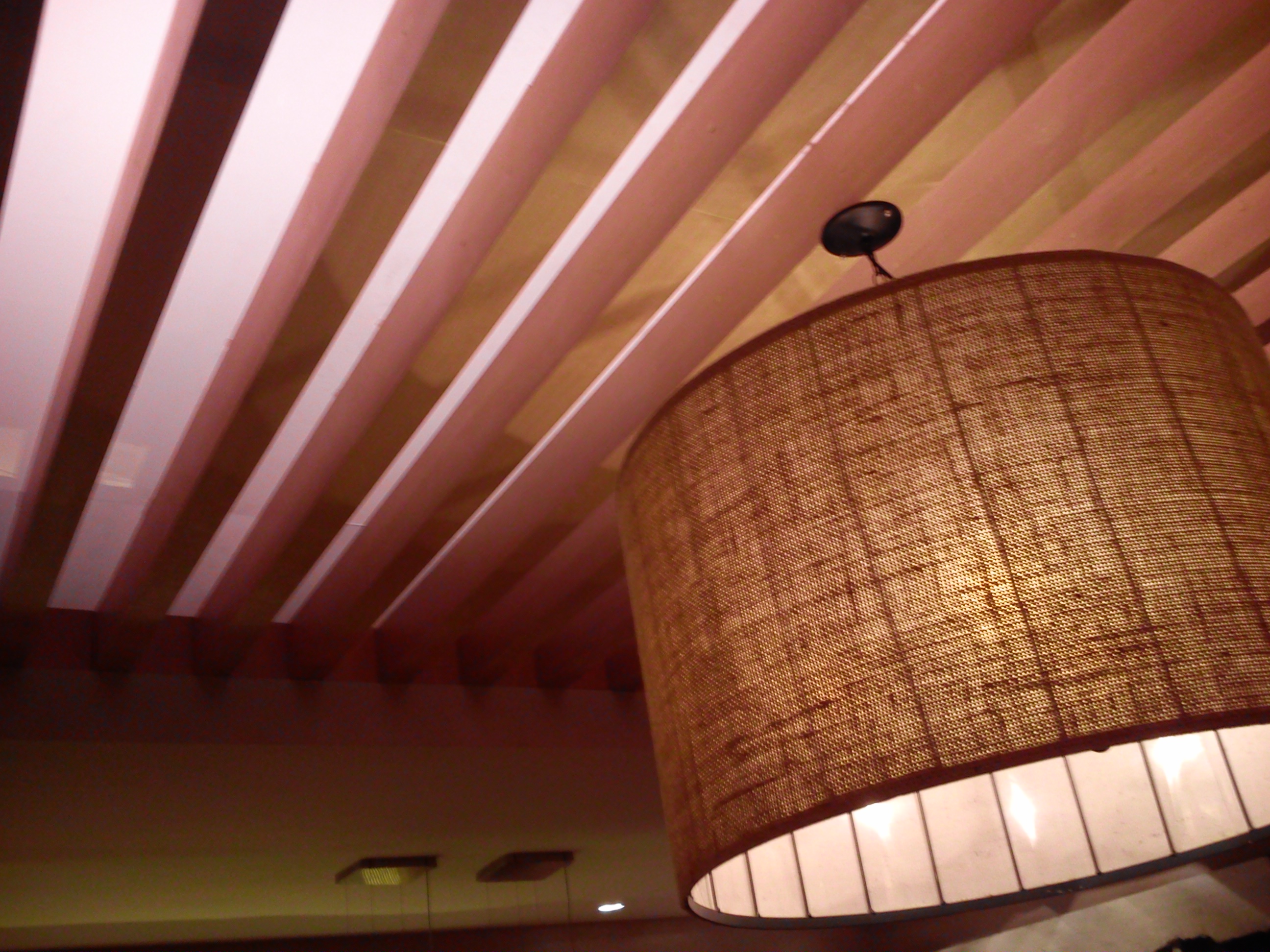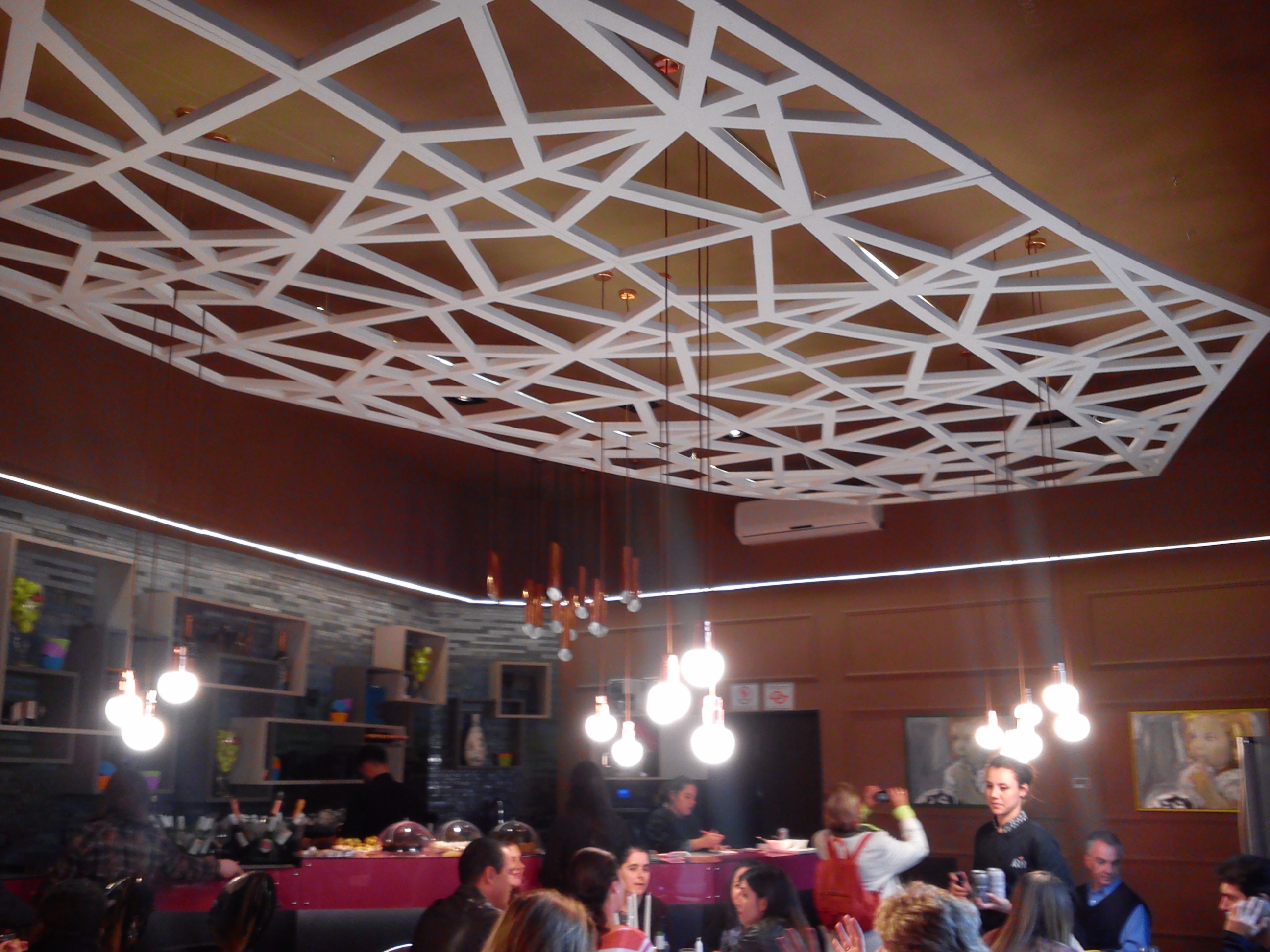 No Café, formando trama irregular no teto, dá leveza e personalidade ao espaço.
