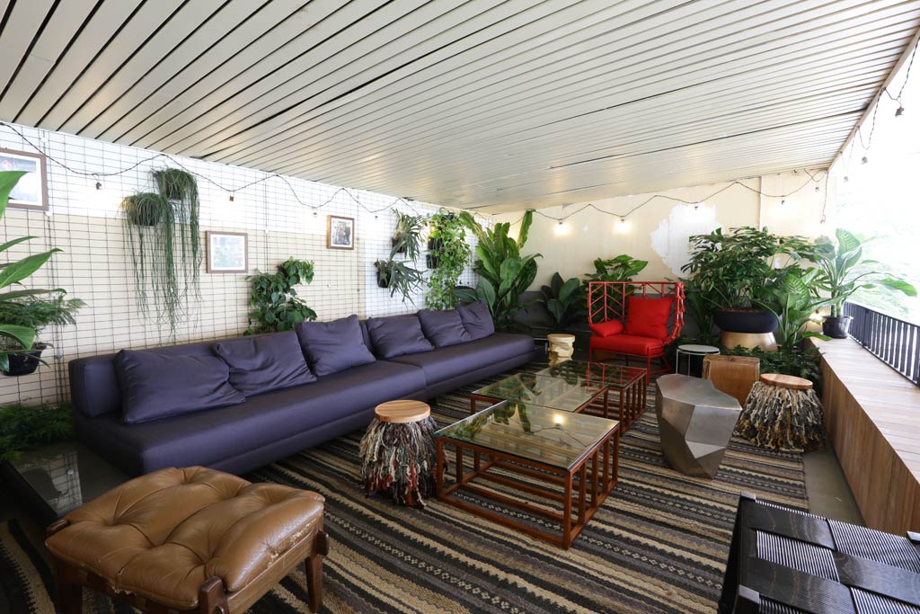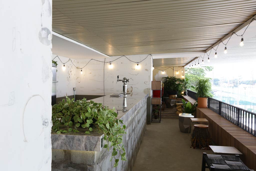 As paredes originais deste espaço no Jockey Clube foram mantidas in natura, sem receber pintura ou qualquer revestimento, revelando a história do local: com paredes descascadas, rabiscos de lápis e bolhas de infiltração. Com lâmpadas penduradas ao redor da varanda, se distribuem entre as geladeiras e móveis antigos de design, desgastados pelo tempo.