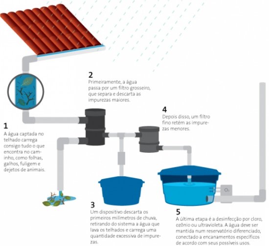 5 – a última etapa é a desinfecção por cloro, ozônio ou ultravioleta. A água deve ser mantida num reservatório diferenciado, conectado a encanamentos específicos, de acordo com seus possíveis usos.