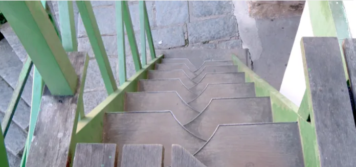 - A inovação nas escadas externas e internas, com degraus em forma de raquete, onde só se pode acessar começando com o pé direito na entrada e com o esquerdo no interior, trazem o melhor aproveitamento de matéria prima, já que só se utiliza uma das pernas de cada lado por degrau.