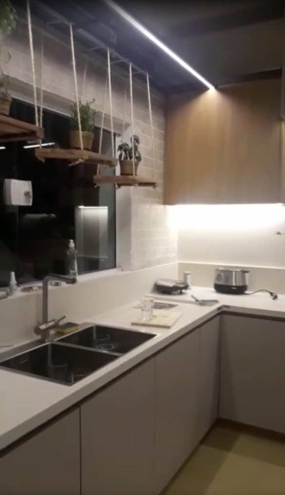 - Na parte central da bancada da pia, a iluminação funcional foi complementada com perfil de LED de sobrepor, centralizada em relação à bancada, também com luminária de amplo facho luminoso e fluxo luminoso suficiente para realização das tarefas.