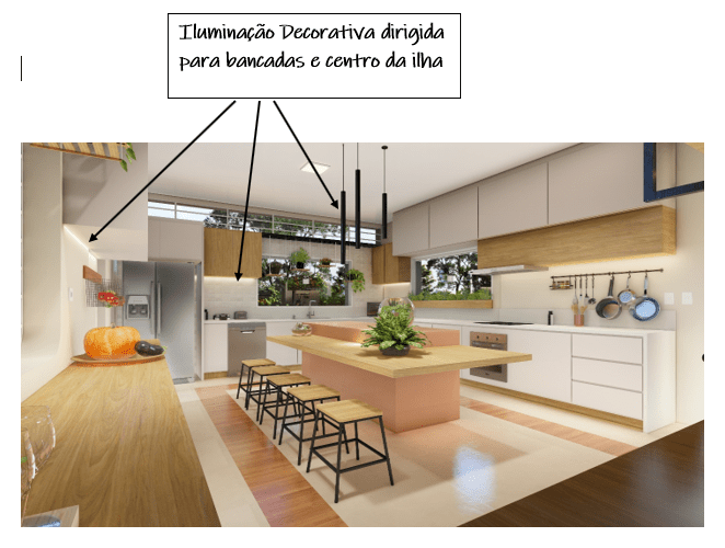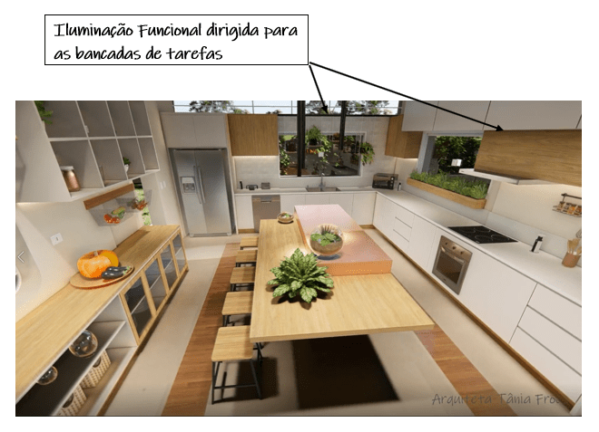 Como local de trabalho com alimentos, as bancadas das tarefas de lavagem, preparo e cocção, recebem iluminação direcionada para estas superfícies, com luminária em perfil de LED, com fluxo luminoso de valor que proporcione a quantidade de luz adequada para a tarefas, com iluminação focal embutida na marcenaria do armário superior, localizada na direção central da bancada, para melhor aproveitamento do fluxo luminoso, evitando a projeção de sombras na superfície de trabalho:
