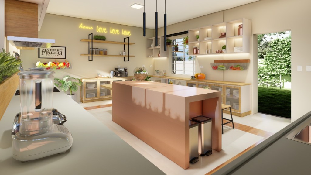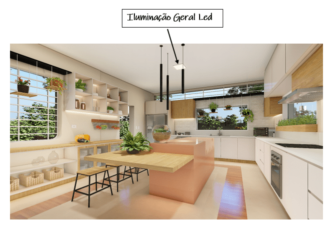 A proposta do projeto luminotécnico da Cozinha Saudável é atingir Conforto Visual em todos os setores, conforme as atividades e tarefas realizadas nas diferentes fases do dia.
