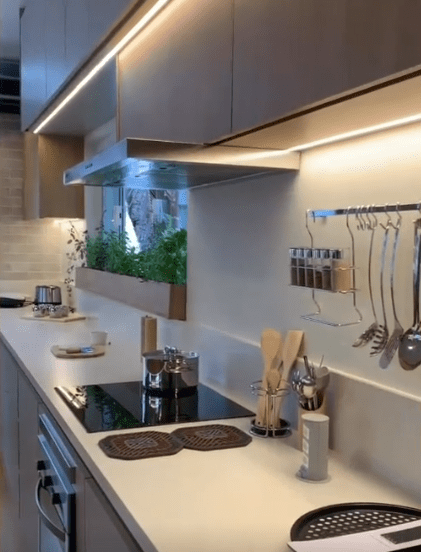Durante a realização das tarefas nas bancadas da pia e do fogão, luminárias em Led embutidas na parte central, acima da superfície de trabalho, evitam a projeção de sombra.